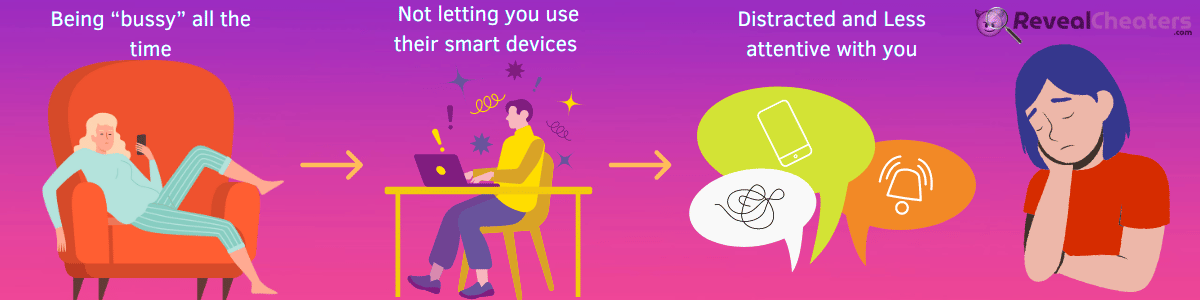 n There could be subtle signs like being "busy" all the time. Paying more attention to their smartphones than you and getting a lot of suspicious text messages that you can't read. The most efficient one is going directly into their phones and seeing what they have installed or their browser history. Last but not least, online tools like RevealCheaters can ease that process a lot by giving you a report of all the accounts they might use.