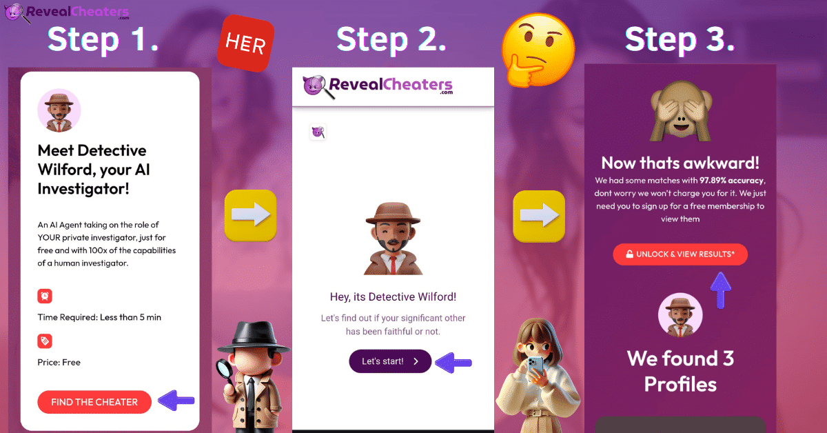 n Besides giving you results for Her, remember that RevealCheaters can also provide information about other dating profiles, whether they are active or not. We can offer a discrete background check and ensure no one knows you used this site to find your partner. Also, once you become a member, you can use this site as many times as you need (5 times a single day) and run tests to find different people.