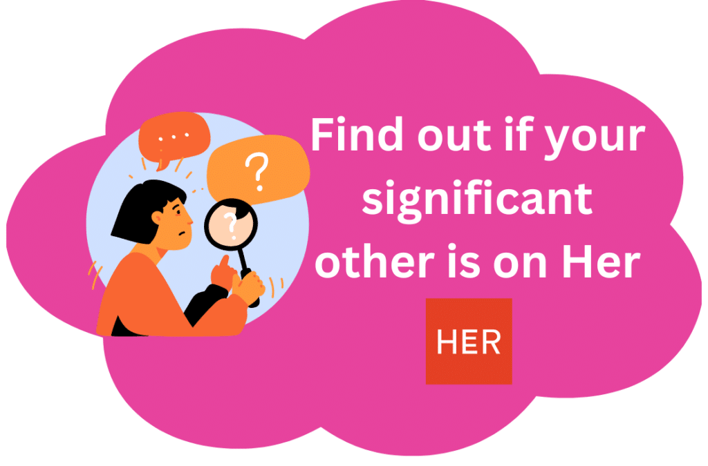 n You can also use a friend's account if you want, but if you want to get to the bottom of this and find your partner's profile, then creating a fake profile with a username and password on Her doesn't sound so bad. Set up your spouse's preferences and see if they appear on the matching list the app will show you. There is also a discovery page where you can see who visited your profile and who has liked you so you can narrow down your search.