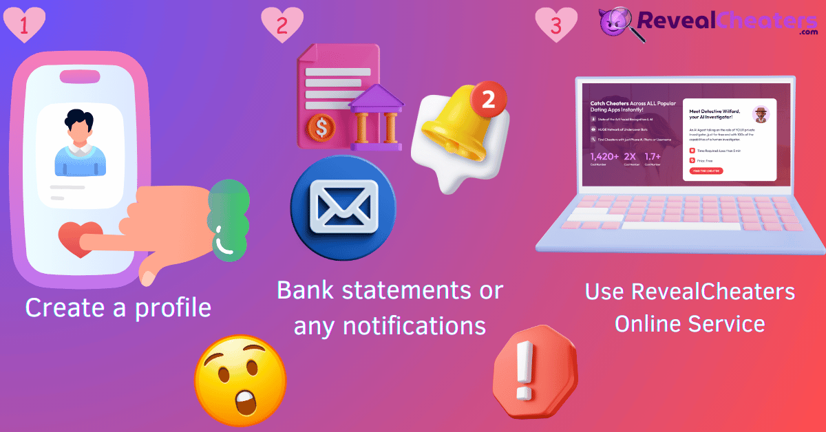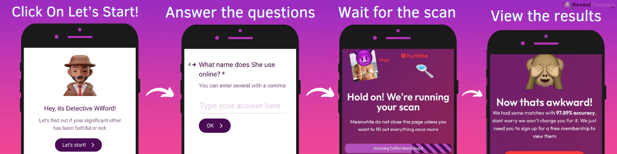 n What you need to do is open any browser and go to RevealCheaters.com. You will need to share some information about yourself and your partner there, so start the search. Most of the data is optional, but if you want better results, you can add them. After you input their username, age, and gender, the AI servers will scan every dating app, showing you if they have an account associated with them.